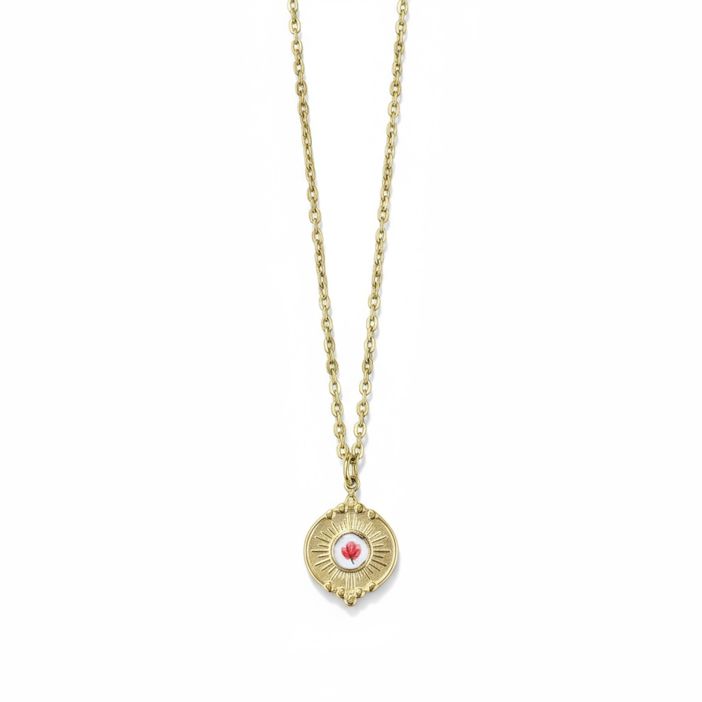 Este collar combina la delicadeza de una florecita en relieve dorado con la elegancia de un diseño circular atemporal. Cada pieza está cuidadosamente trabajada a mano, reflejando la inspiración en los pequeños detalles de la naturaleza que florecen en el Caribe.